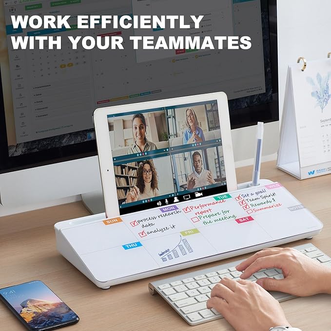 • PERFECT DESIGN: Quickly record your weekly schedule-Sunday through Monday. Maximize your work area. The desktop weekly calendar whiteboard is designed to sit perfectly between a keyboard and monitor and is slope angled for comfortable reading and writing, or typing when you are using it as a keyboard stand.