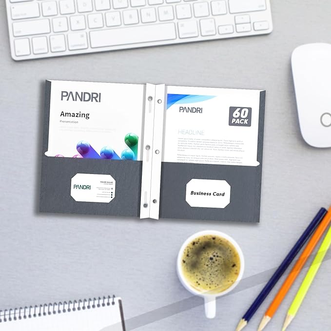 Two Pocket Folders, PANDRI 60 Pack Two Pocket Folders with Prongs, 3 Prong Folders Designed for Office and Classroom, Letter Size Grey