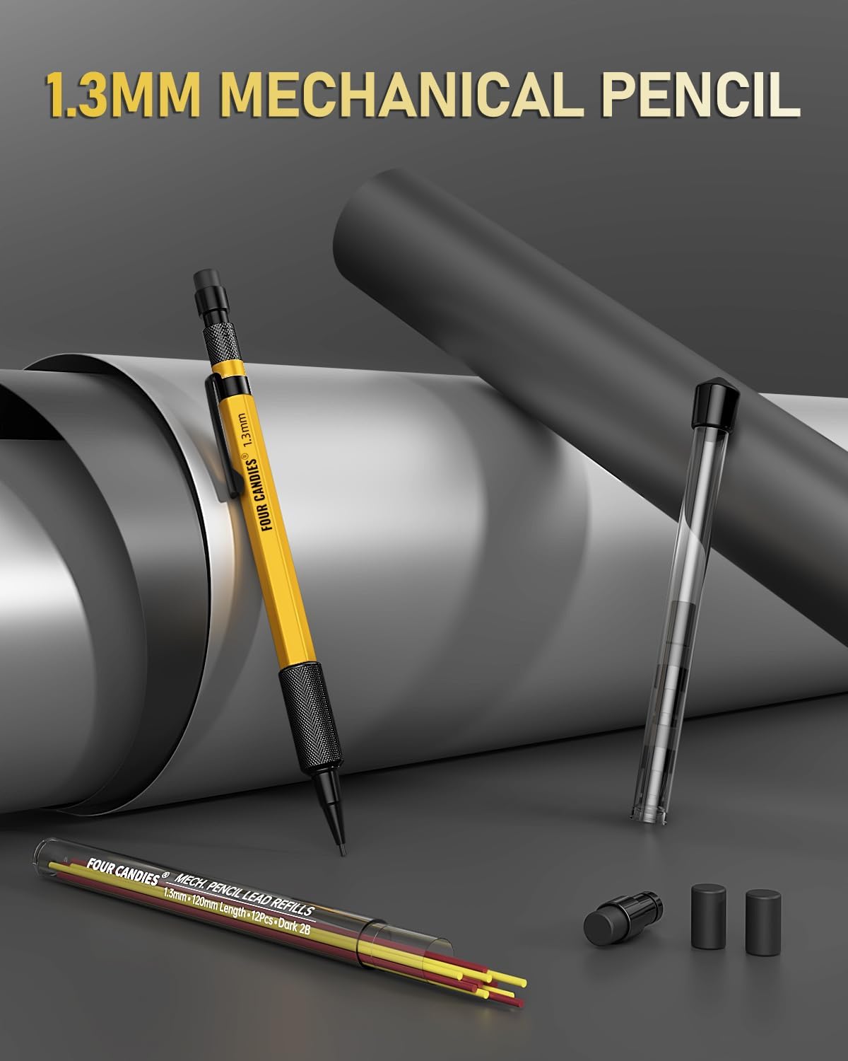 - Exquisite Carpenter Set: Includes 1pc 1.3mm metal mechanical pencil, 1 tube of 2B lead refills (12pcs/tube), 12pcs color lead refills (red & yellow), The length of each lead is 120mm, 1pc 4B soft erasers, 6pcs cap eraser refills (3pcs eraser with base), a plastic mechanical pencil case.