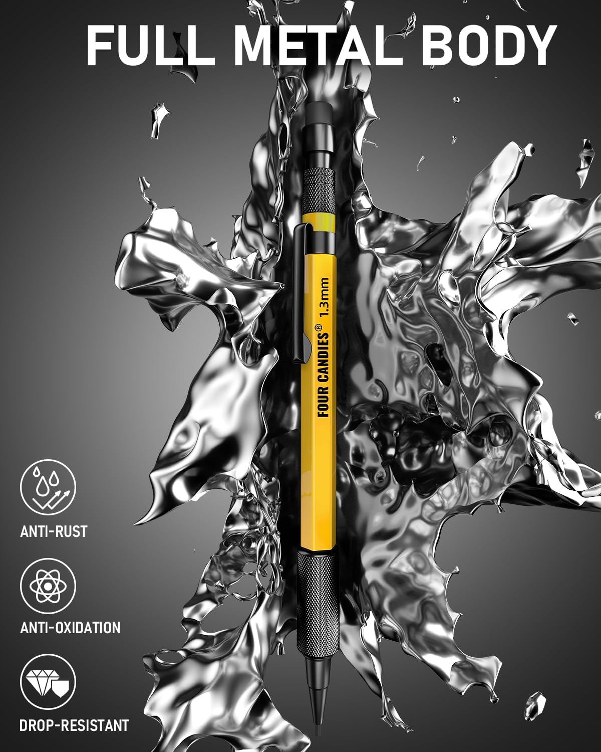 Four Candies 1.3mm Mechanical Pencil Set with 24 Lead Refills, Metal Weatherproof Heavy Duty Outdoor Carpenter Pencil, Eraser, 6 Eraser Refills for Architect Drafting Woodworking Marking with Case