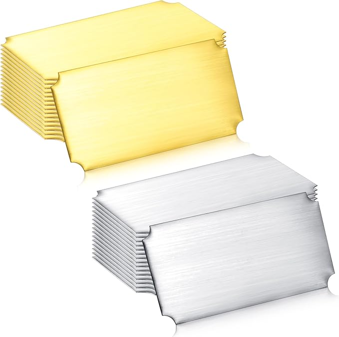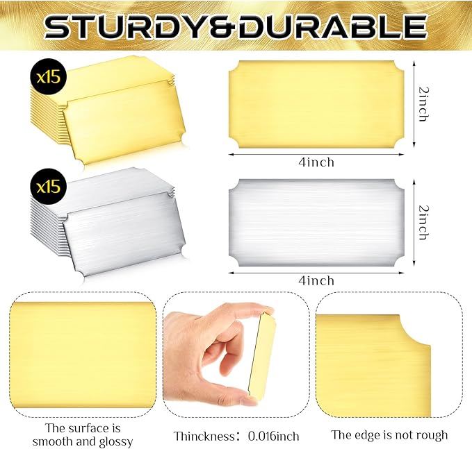 Therwen 30 Pcs Name Plates Laser Engraved Brushed Stainless Steel Plate Personalized Plaque Blank Custom Name Tag Frame Label with Adhesive Backing(Silver and Gold Notched Corner,4''x 2'')