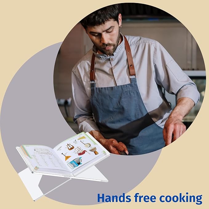 - [Variety of uses] Everyone needs a cookbook holder that doesn't get stained and can hold any book that is put on it. Cookbook holders for kitchen counter should be as elegant and easy to set up as this one is. A clear acrylic book display stand transparent for tablet holder is all you need to free your hands so you can multitask. Our sleek, "X" shaped book stand can also double as a bible pedestal stand.