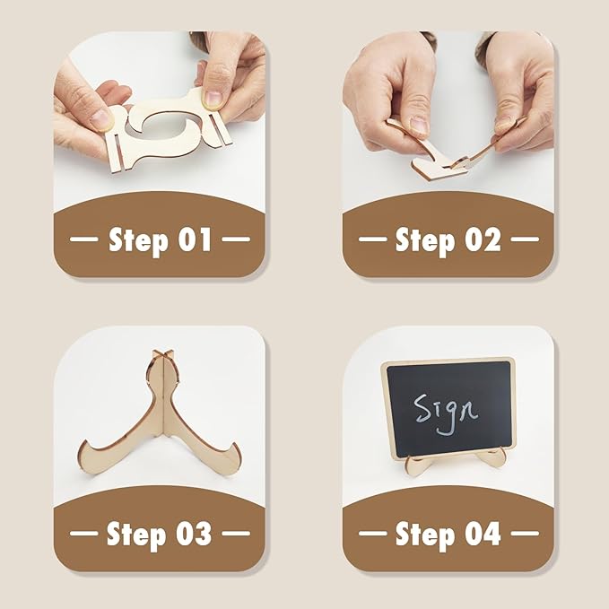 - What You Received: There are 12 pcs rectangle-shape boards, 24 pieces wooden stands, 6 pcs replaceable labels and 1 liquid chalk marker