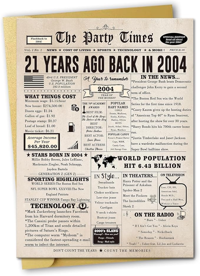 - 21 Birthday Gifts: A memorable 21 birthday card for your family or friend. The card is filled with interesting stories,let us recall the past,prepare a commemoration significance gift for your recipient.