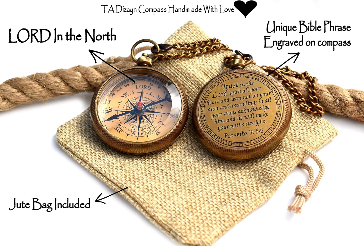 - Solid Brass Compass Antiquated Brass Finish With Trust in The Lord with All Your Heart -Proverbs 3: 5-6 Quote Engraved Compass with Jute Bag.