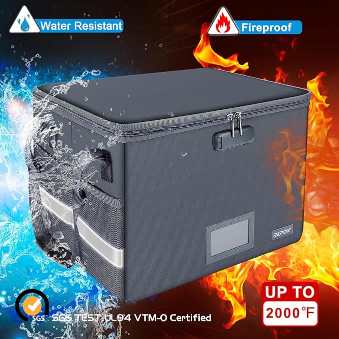 - Fireproof and water-resistant: Fireproof lock box is made of double layered non-itchy silicone coated fiberglass which stands up the temperature up to 2000℉.It has been passed by SGS TEST(UL94 VTM-0 Certified).Fireproof file box is not only fireproof but also high water resistant in case it gets wet for any reason.Nothing is completely foolproof, but added protection is always a good idea.