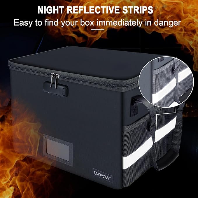 - Dust-proof and reflective strip design:Are you still worried about the storage box is often covered with dust? The dust-proof material can prevent dust from sticking to the outside of our fireproof box, always keep it neat and tidy.The reflective strip design on the side of the box allows you to immediately find your fireproof box even at night, protecting irreplaceable documents and valuables from fire.