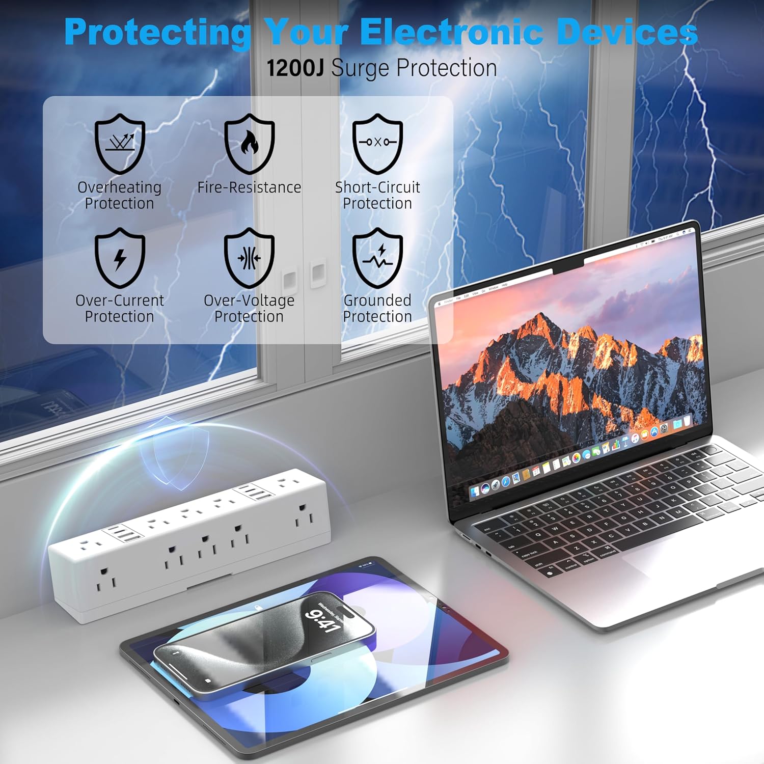 - 【1200J Surge Protection】-Made from fire-resistant ABS plastic, this desk plug station features a built-in circuit breaker for overload, short circuit, and overheat protection, effectively handling voltage spikes, protecting your computer and accessories.
