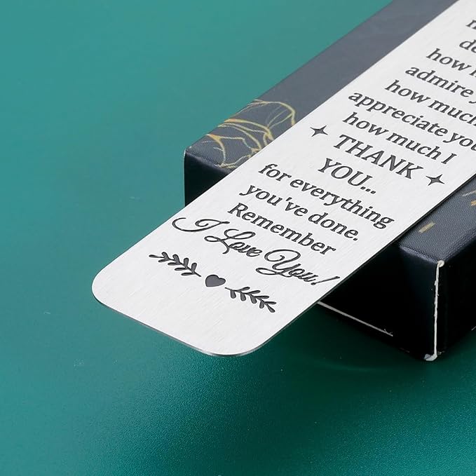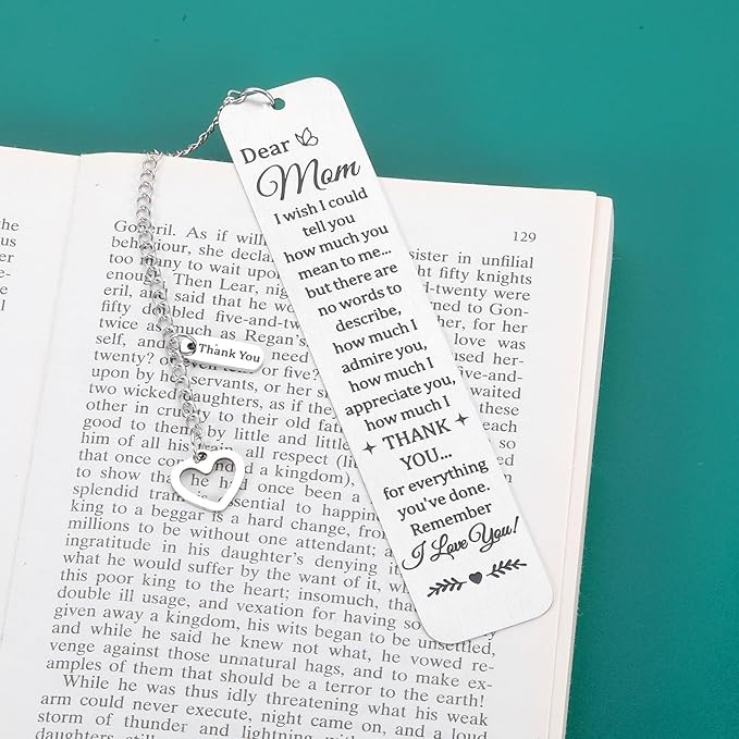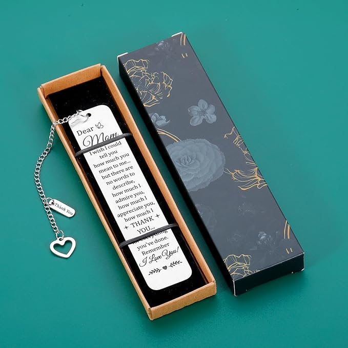 - Mom Gifts for Christmas: The mom bookmark with thank you and heart chain is engraved with: "Dear mom, I wish I could tell you how much you mean to me but there are no words to describe how much I admire you and how much I appreciate you how much I thank you for everything you've done remember I love you," suitable given away to mom, mother, mommy, new mom, stepmom, mother in law, mom-to-be, first-time mom, new mother, mother to be, mum, special mom, adoptive mother, foster mom, nana, grandma.