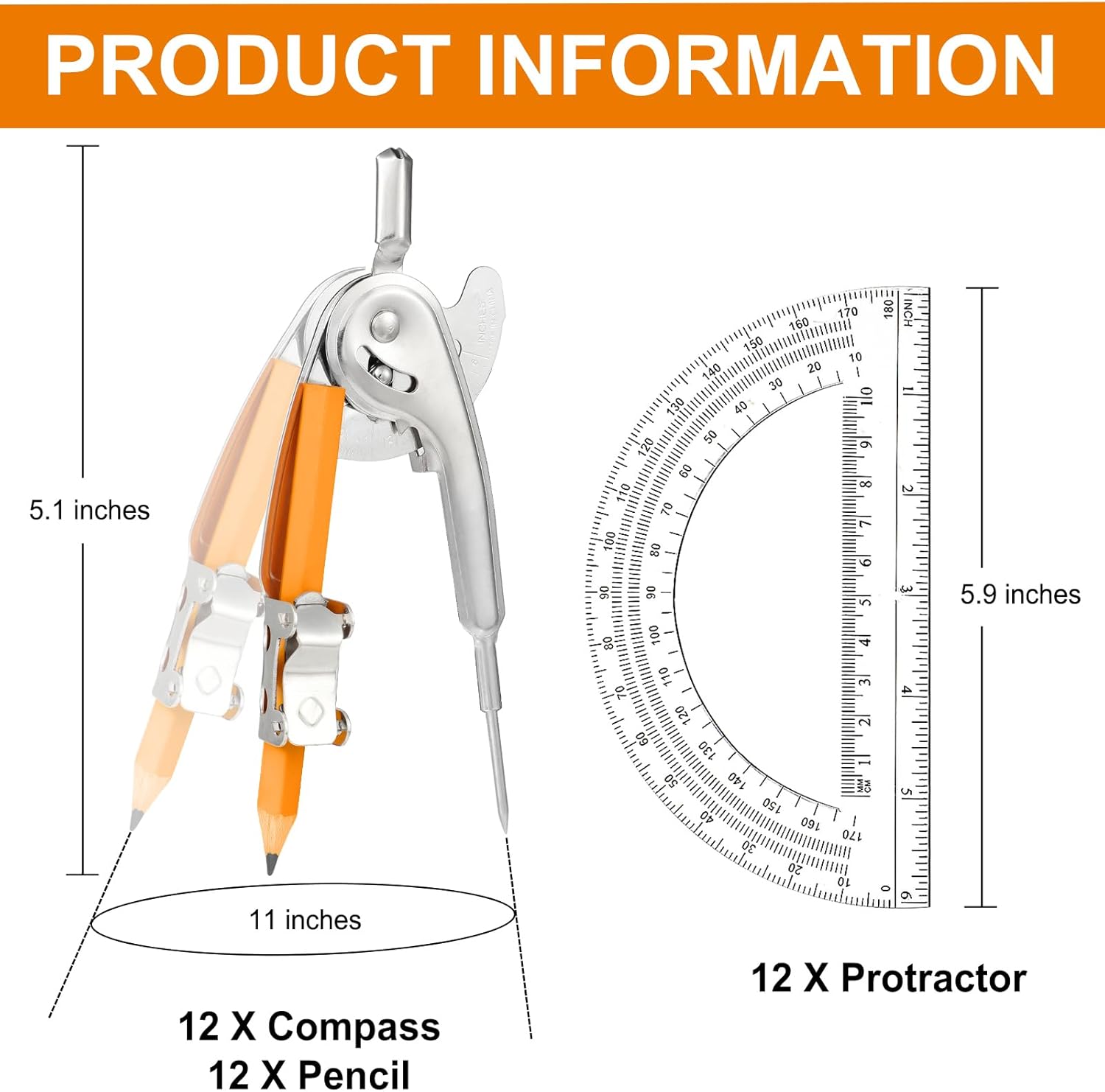 - Appropriate Size: each metal compass is 5.1 inches long and can draw a circle with a diameter of up to 11 inches, or various circles can be drawn as needed; The plastic protractor has a diameter of 6 inches and a range of 0-180 degrees; These math compass and protractor set are ideal for school projects, mathematical geometry, and artistic architectural drawing, helping you quickly complete your work