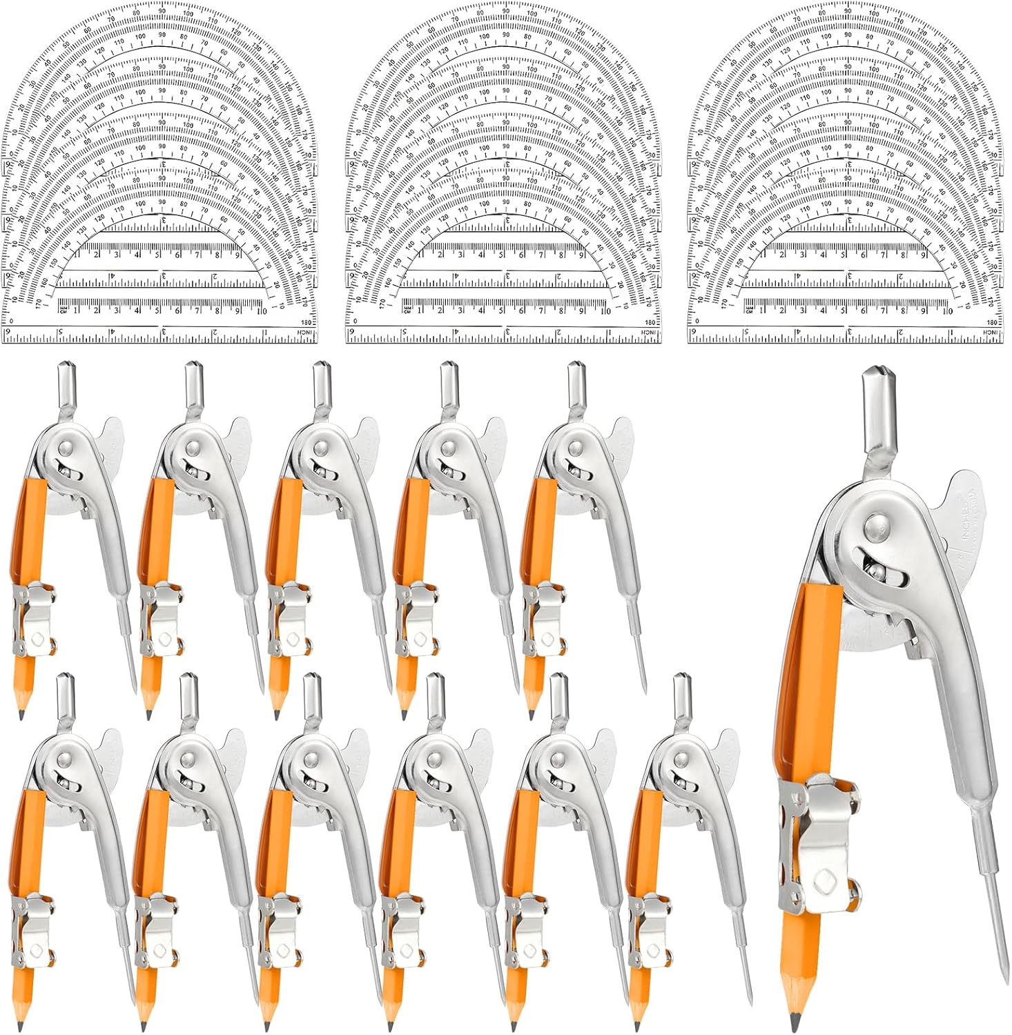 - Value Compass Geometry Tool Set: you will receive 24 pack geometry compass set, including 12 pieces of math compass with pencils and 12 pieces of geometric protractors, enough to meet your different work or study needs, and share with family or friends