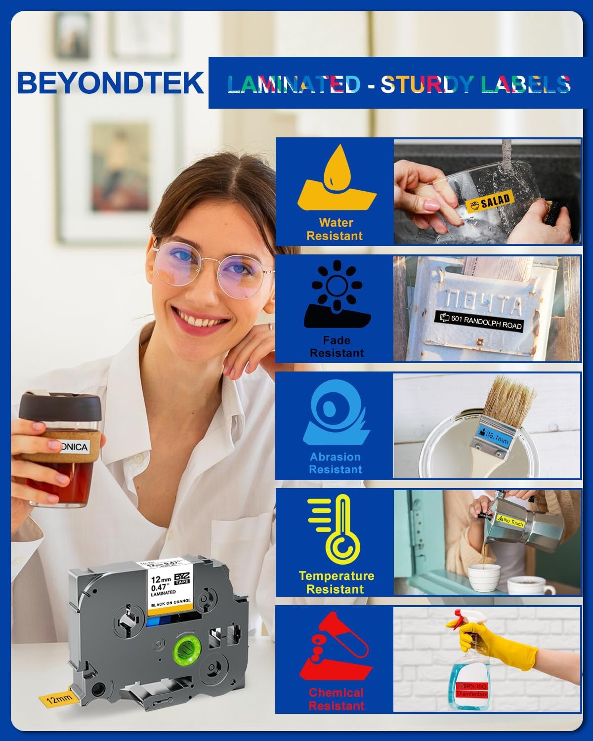 - 【P Touch Label Maker Tape 12mm 】: Indoor or outdoor labels,These Laminated label tapes are Water Resistant, Grime Resistant, Grease Resistant, Temperature Resistant, Abrasion Resistant, Chemical Resistant as well as Fading Resistant.