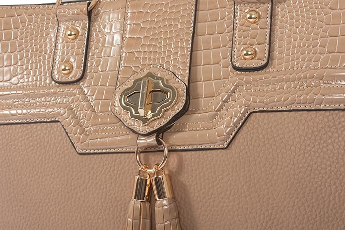 - Stylish JKM taupe beige rolling laptop case or briefcase for women. Taupe pebble texture faux leather exterior with taupe patent style faux alligator trim.