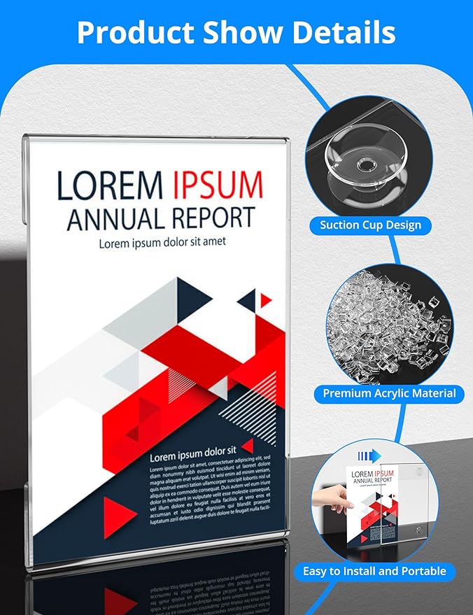 - FLEXIBLE AND STURDY - Made of thick, high-quality acrylic, the clear sign holder with suction cups is flexible enough to bend from the top and insert a document or picture while the plastic piece holds the document tightly and won't slip out.