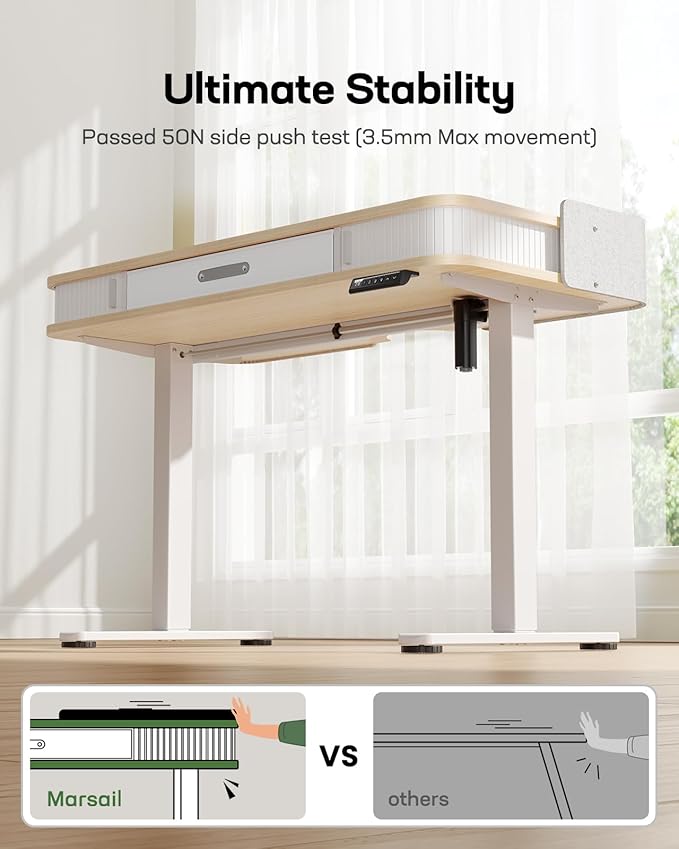 - High Stability: The one-piece desktop rests on a sturdy steel frame. The desk has passed side-push testing, with less than 3.5mm of lateral movement against 50 newtons of applied force.