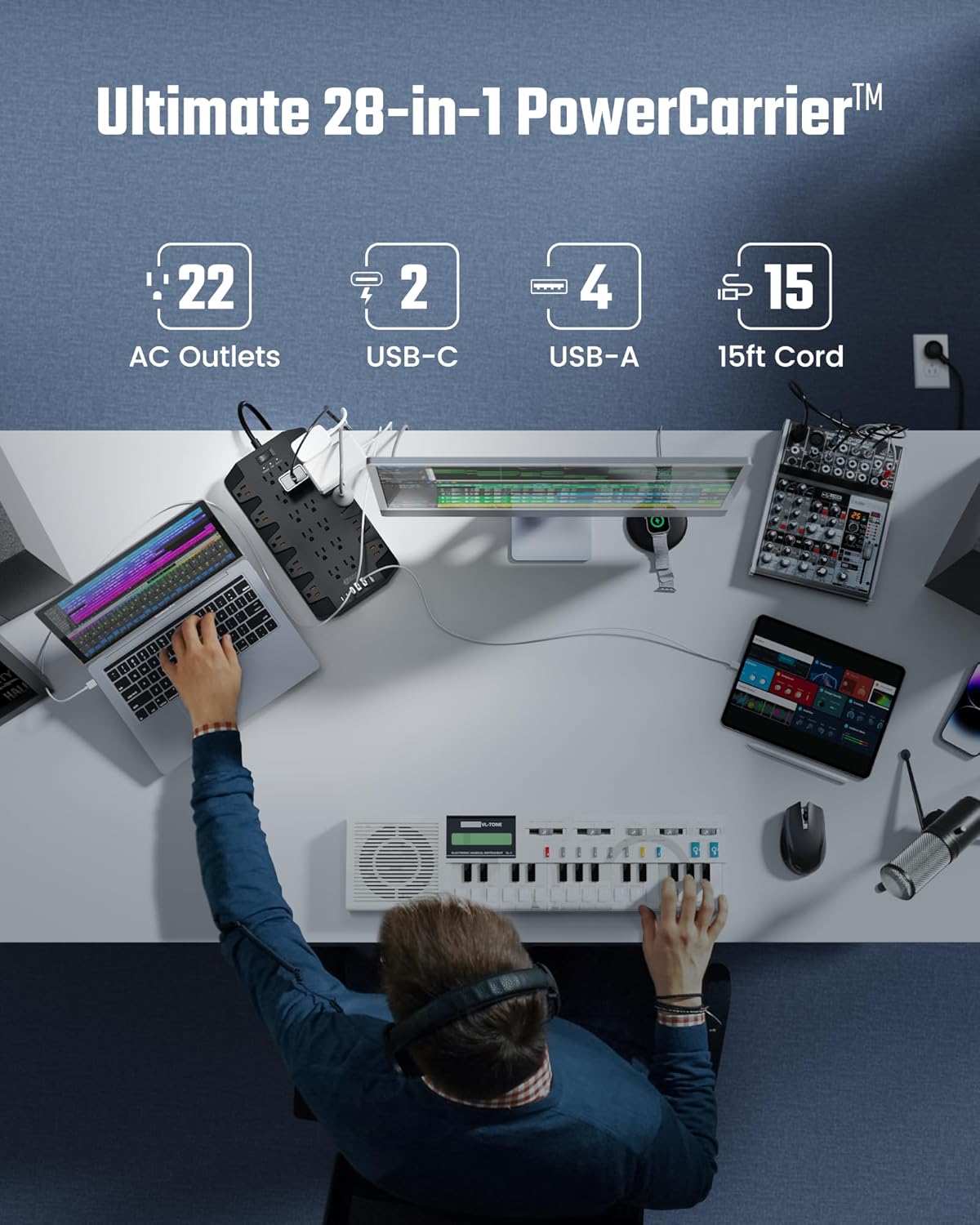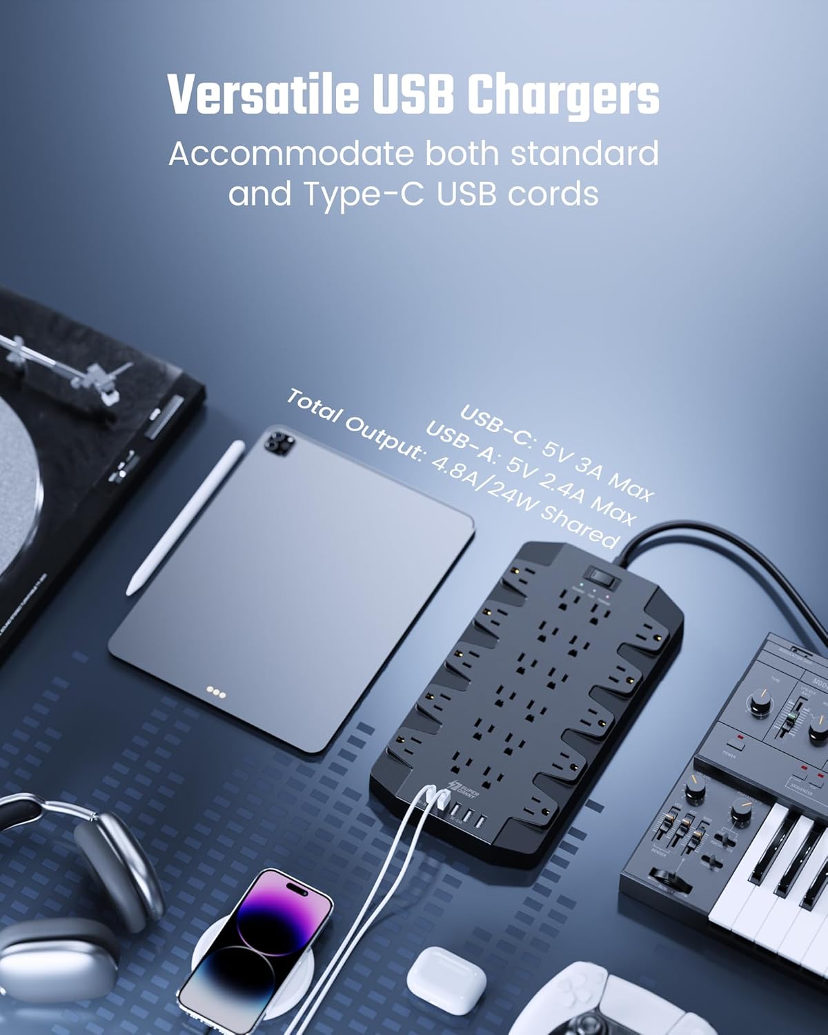 - 【Ultimate 28-in-1 PowerCarrier】With 22 grounded 3-prong outlets and 6 USB ports (2 USB-C + 4 USB-A), SUPERDANNY NEWEST large power strip accommodates all the power devices in one place. Only one charging station is enough for all your gaming setup, media essentials, phone, tablet, PC, laptop, computers, headphones, sound system, TV, router, monitor, camera, smartwatch, microphone, printer, fax machine, scanner, fan, etc. Have a clutter-free gaming corner or home office now.