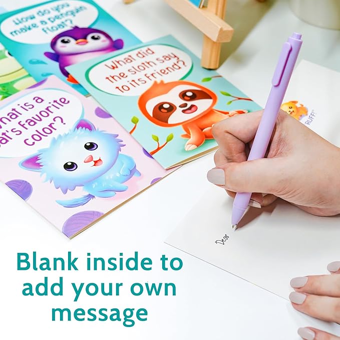 - 24 UNIQUE DESIGNS – NO REPEATS - Say goodbye to dull, repetitive cards! This fun and colorful set stands out with 24 unique notecards, each featuring adorable hand-drawn animal illustrations and jokes that are sure to bring a smile. The wholesome jokes printed on the front of the card are even more fun when they open the card to find the punchline, paired with a cute bonus illustration inside!