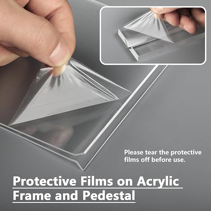 - Double-Sided Display Sign Holder: Clear display stand allows your flyer to be displayed and protected on both sides, unlike slant back sign holder, which only allows you to display on one side. Warm Tips--Please remove the protective film on the acrylic panel and base which designed to prevent scratches on the product before using.