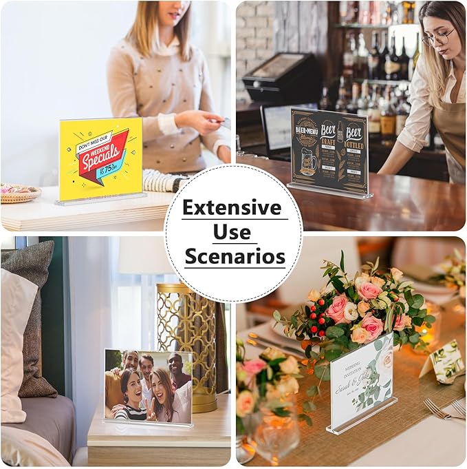 - Widely Used: 2 Pack 8.5x11 acrylic sign stands can meet your different needs. They can display flyers, advertisements, menus, brochures, etc, and can be used in restaurants, offices, weddings, vendor events, or small business supplies.