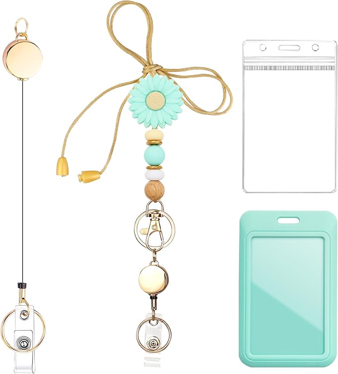 Colorful ID Badge Holder with Silicone Beads Lanyard Set,Cute Teacher Breakaway Lanyard for Keys & Keychain with Cute Retractable Badge Reel Holder,Gift for Women,Nurse, Teacher. (X)
