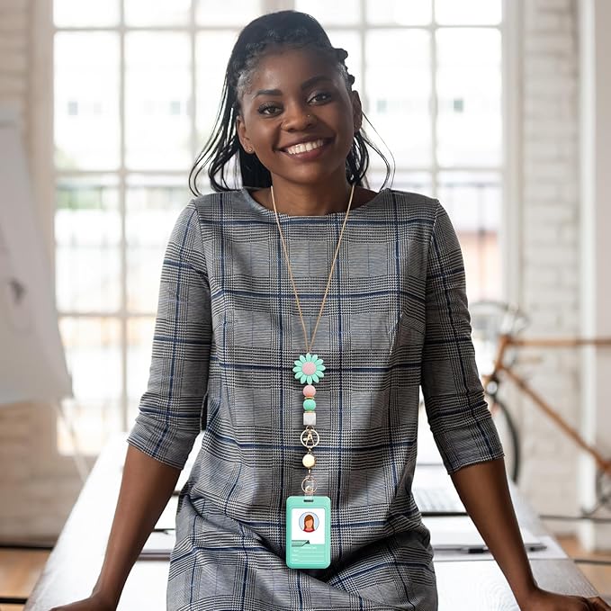 Colorful ID Badge Holder with Silicone Beads Lanyard Set,Cute Teacher Breakaway Lanyard for Keys & Keychain with Cute Retractable Badge Reel Holder,Gift for Women,Nurse, Teacher. (Daisy 1)