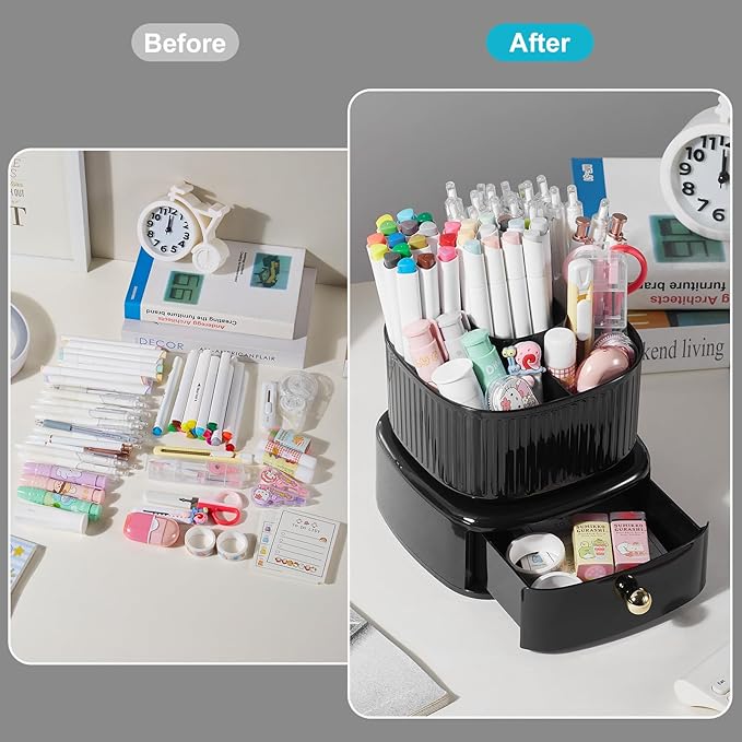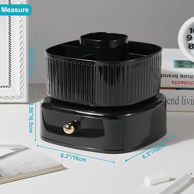 - 5 COMPARTMENTS WITH DRAWER DESIGN: The unique desk organizer is unique, extremely concise, compact and divided into 5 compartments with drawer. This turntable pencil holder for your desk is not only perfect for storing your desktop stationery such as pens, pencils, markers, highlighters, rulers, staplers, erasers, paper clips, scissors, letter openers, and many other desk widgets but also great for storing your makeup brushes, nail polishes, lipsticks, and other small personal items.