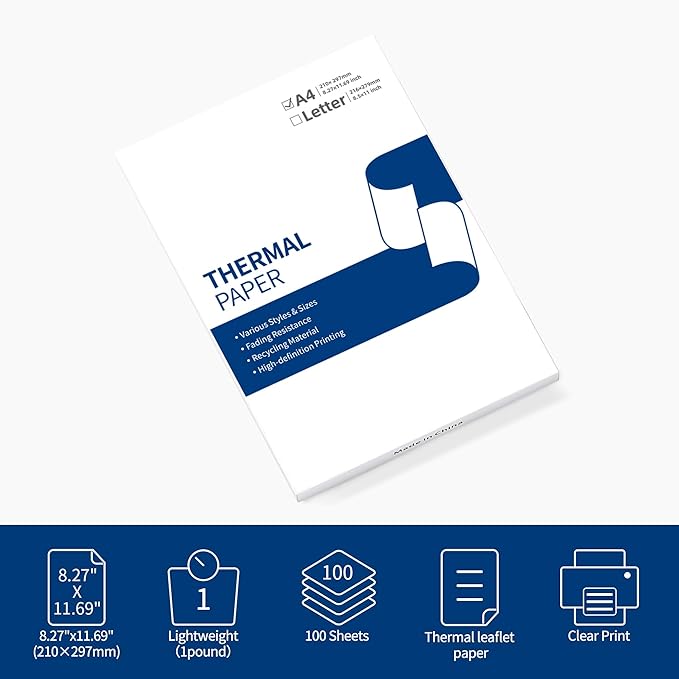 - Dimensions - The set is a4 thermal paper size, single sheet type, 200 sheets per pack, Hint: Only suitable for thermal printers, not for laser or inkjet printers.