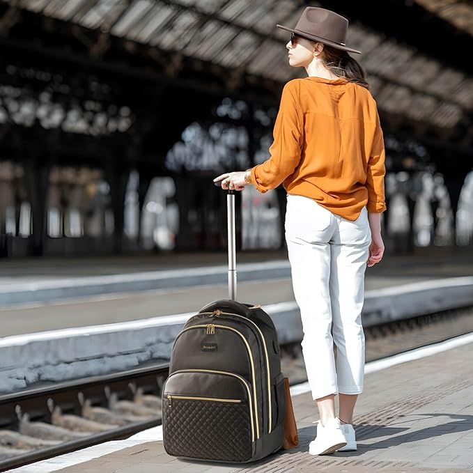 Rolling Backpack Carry On Luggage For Adults With Wheels, 40L Wheeled Backpack For Women, Travel Roller Backpack, Rolling Bag, Black Gold
