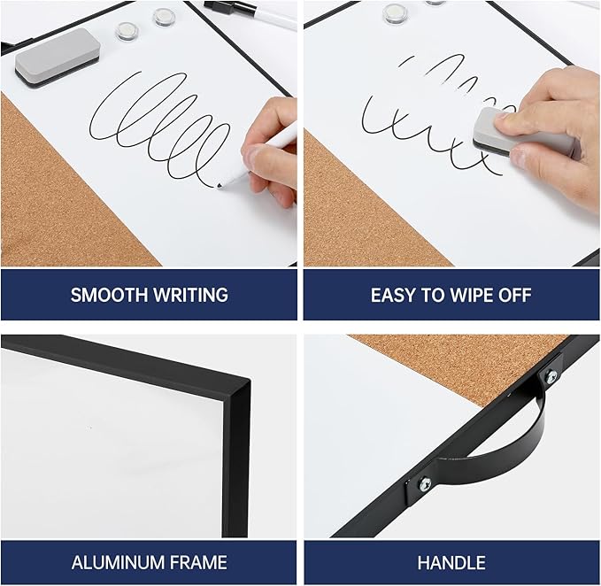 - PREMIUM QUALITY: This 12" X 16" small whiteboard set includes a dry erase board and corkboard. The magnetic whiteboard comes with a smooth surface, easy to clean up and write on. The bulletin cork board is equipped with premium durable cork, fits all variety of nails and pins without damage to the cork.