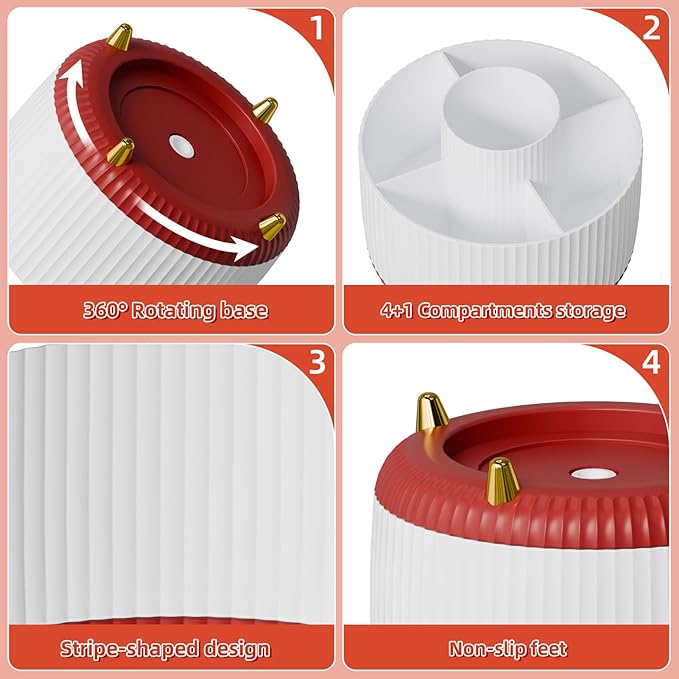 Marbrasse 360-Degree Rotating Pen Holder, Desk Organizer with 5 Compartments, Art Supply Storage Box Caddy for Office, Home (White+Red)