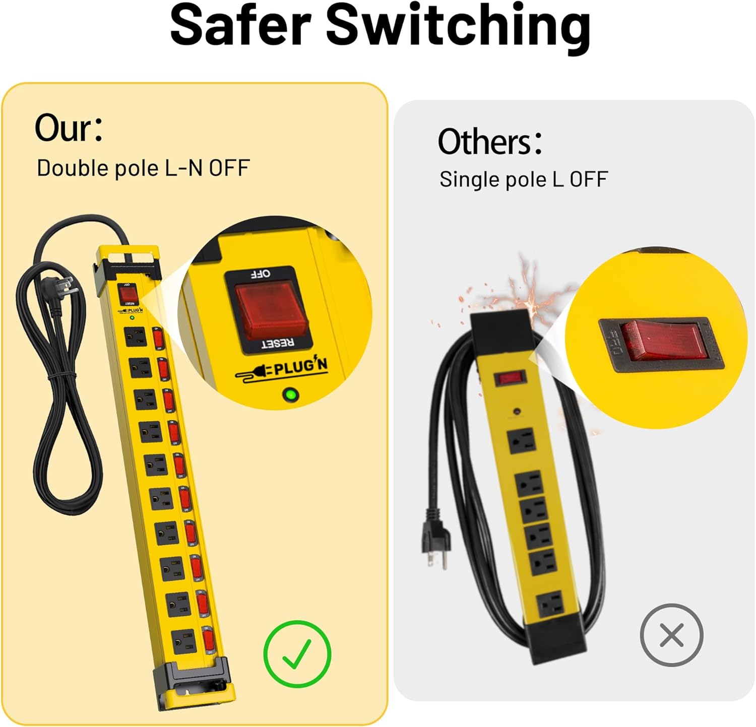 Plug'n 10 Outlet 3300J Surge Protector Power Strip with Individual Switches,Heavy Duty Metal Power Strip with Cord Manager,3FT/14AWG/15AMP/1875W Power Cord for Workshop,Garage