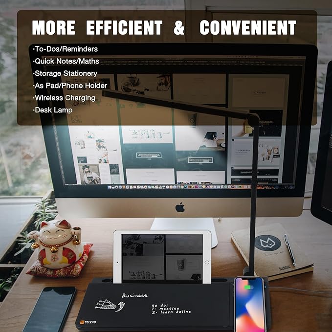 - ✅ MULTIFUNCTIONAL: Storage, wireless charging, lighting, write, mirror, hold iPad/iPhone, keyboard stand, our desktop white board is an all in one multipurpose board. Equipped with 1 adapter, 2 black dry erase markers, 1eraser and 5ft USB Type C cable, instructions.
