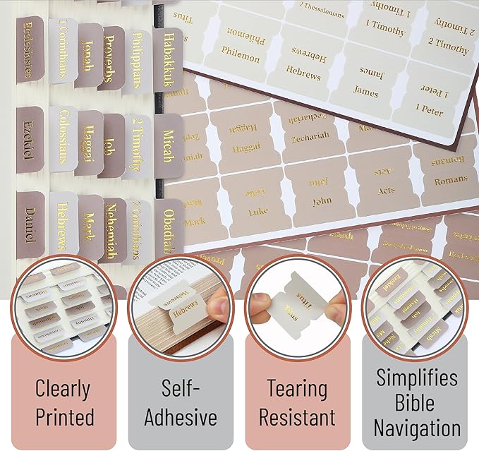 - With their large, clear font and bright printing, these Bible tabs offer a convenient organizational tool for those looking to engage in Bible study or journaling.