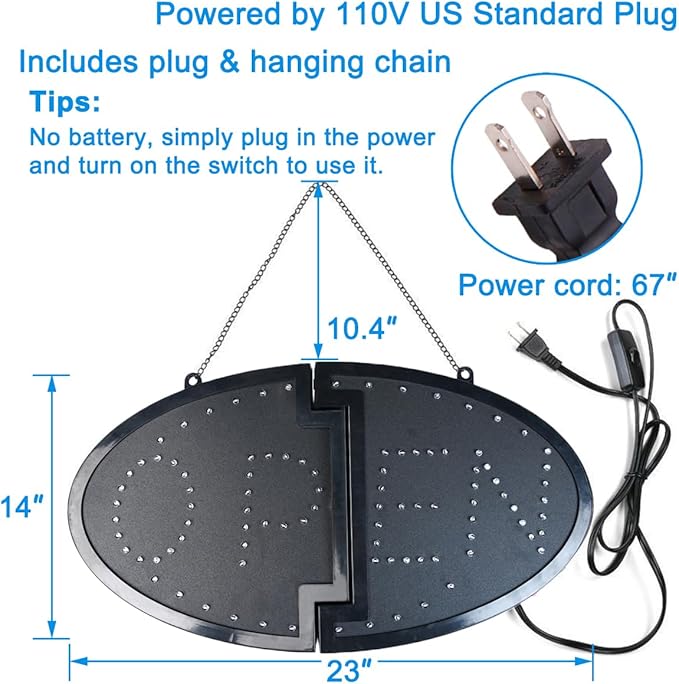 - EASY TO USE: Open sign board comes with a sturdy stainless-steel hanging chain to hang anywhere you want to display, then plug in and turn on the switch, and your storefront window will instantly light up with a dazzling new sign.