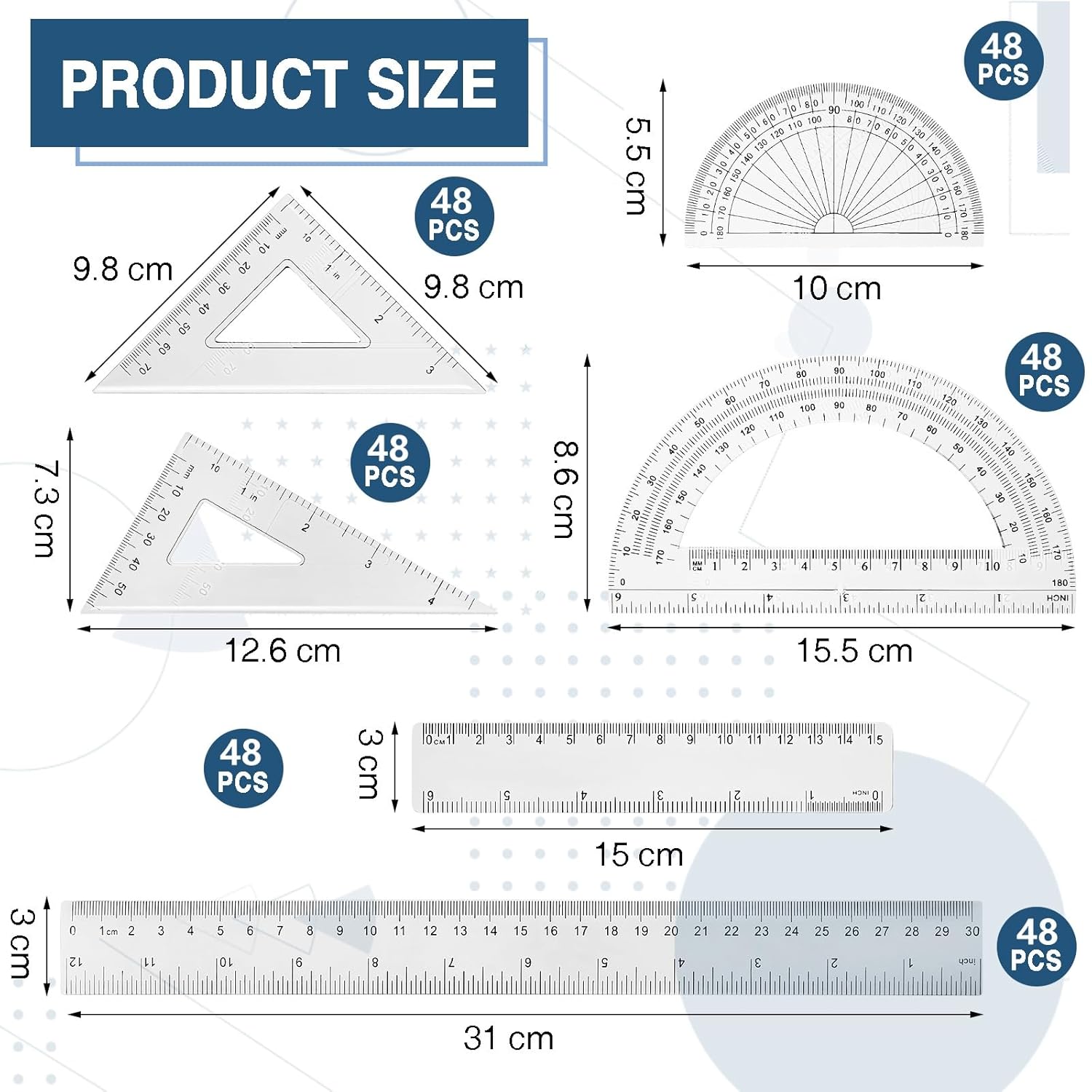 - Complete math tool set: You will get 48 6-inch protractors, 48 4-inch protractors, 48 45-degree triangles, 48 60-degree triangles, 48 6-inch rulers and 48 12-inch rulers, a total of 288 pieces; the complete combination meets the needs of various occasions, you can choose the appropriate ruler to work according to your needs