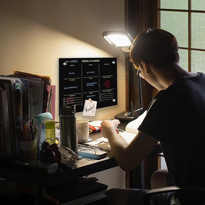 - Modern & Luxurious Design: This is a weekly calendar dry erase board that combines black glass and golden lines. The golden planning layout is printed on frameless black tempered glass, and the modern design adds a touch of taste and luxury to your home or office