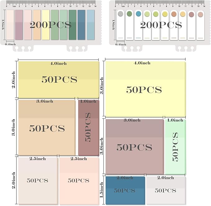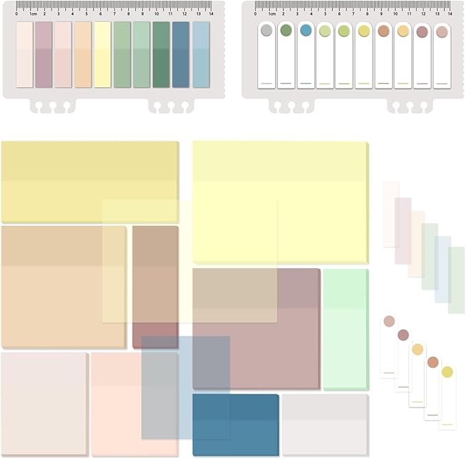 - What Will You Get: 500 Sheets transparent sticky notes, 10 different colors and different sizes clear sticky note tabs, sufficient in quantity, 400 Sheets morandi different colors book tabs(1.8x0.4 inch)