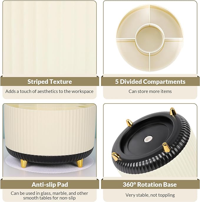 SKYDUE 360 Degree Rotating Desk Organizer, Dual-Purpose Pencil Pen Holder for Desk, Rotating Desk Pen Organizer with 5 Slots, Pencil Cup for Office, School, Home (Beige-Black)