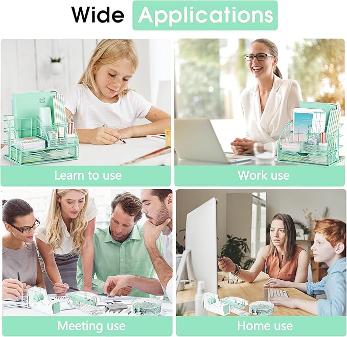 Green Desk Accessories, Office Desk Organizers and Accessories Supplies with Mesh Desk Organizer, Tape Dispenser, Stapler, Staples, Ballpoint Pen, Clips Set, Ruler, Scissor, Sticky Tabs