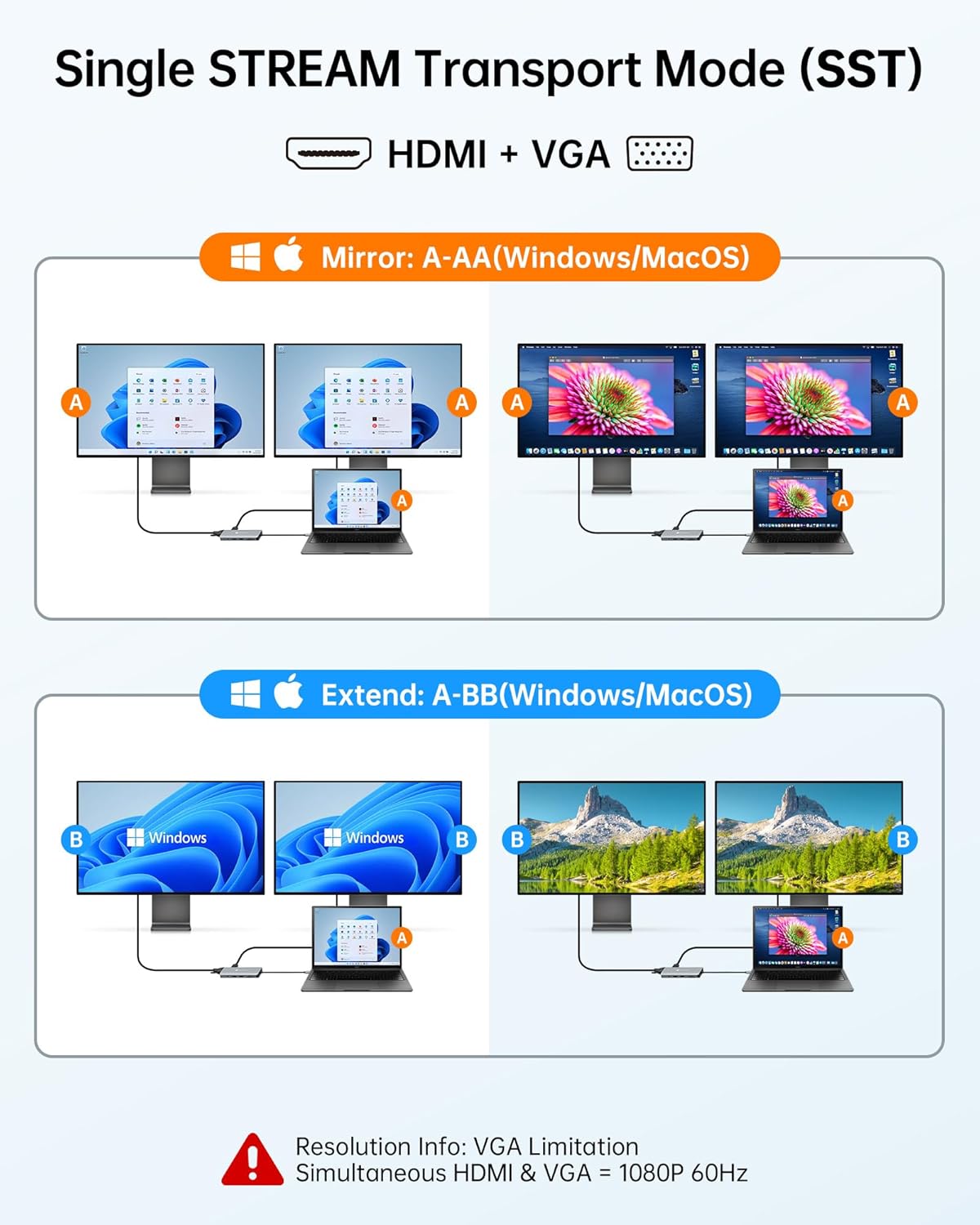- 𝗦𝘁𝘂𝗻𝗻𝗶𝗻𝗴 4K@60Hz HDMI & VGA Output: Easily extend or mirror your display with the USB C to HDMI adapter supporting 4K@60Hz resolution, or connect older displays via the VGA port with Full HD 1080p, making this USB C hub HDMI ideal for work presentations, streaming, or multitasking.
