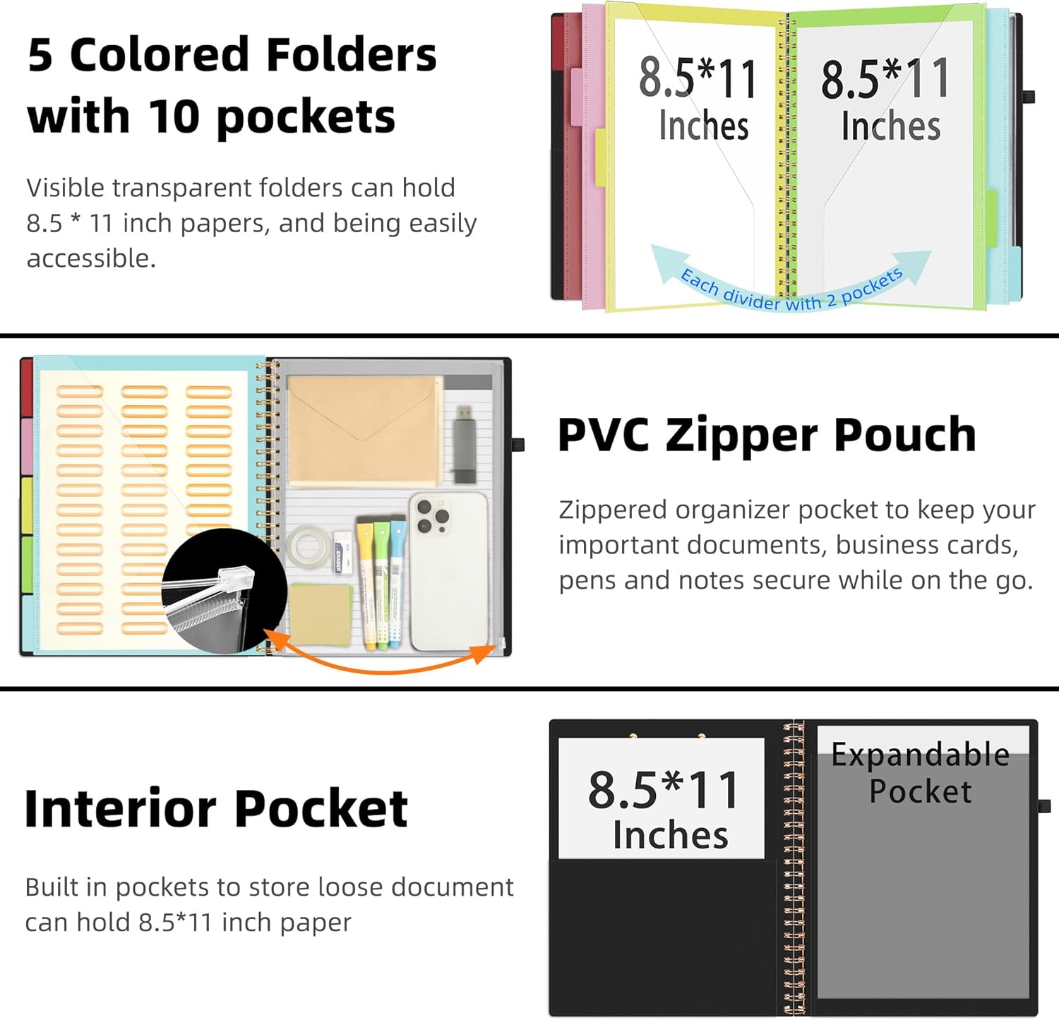 - 【Stay Organized】The portfolio organizer features a clear, zippered pouch for secure on-the-go storage of documents and notes, interior pocket to store letter size papers and important loose documents. Clipboard comes with 5 extra Plastic Colour Folders with 10 pockets fit in all standard US letter size sheets(11*8.5''), plus 39 file folder labels self adhesive stickers for organized use.