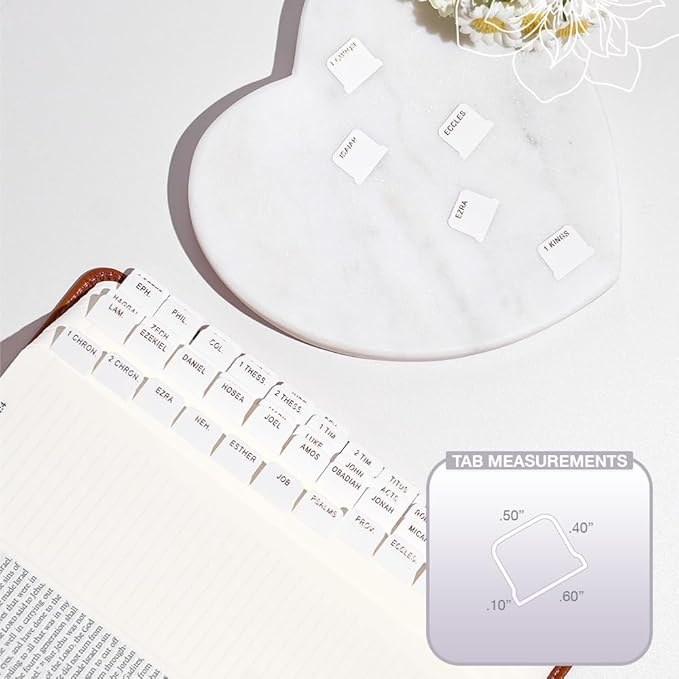 - Easy Installation: Tabs come with directions and a tab guide for perfect placement in your Bible; Each tab is pre-cut and self-adhesive so simply peel, align in your Bible, and stick!