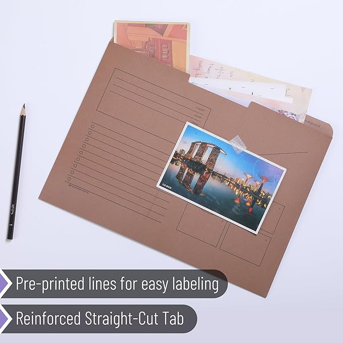 - Each folder is designed with pre-printed lines and boxes for easy labeling and indexing, making it simple to categorize and retrieve files.