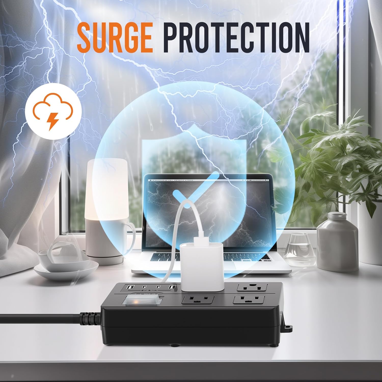 - 【High Level Waterproof】IPX6 rated surge protector power strip can withstand rain, water splash,and even water flow,Power on through any weather – stay connected and safe; When water flows into the sockets, it will flow out through the drainage holes on the back.