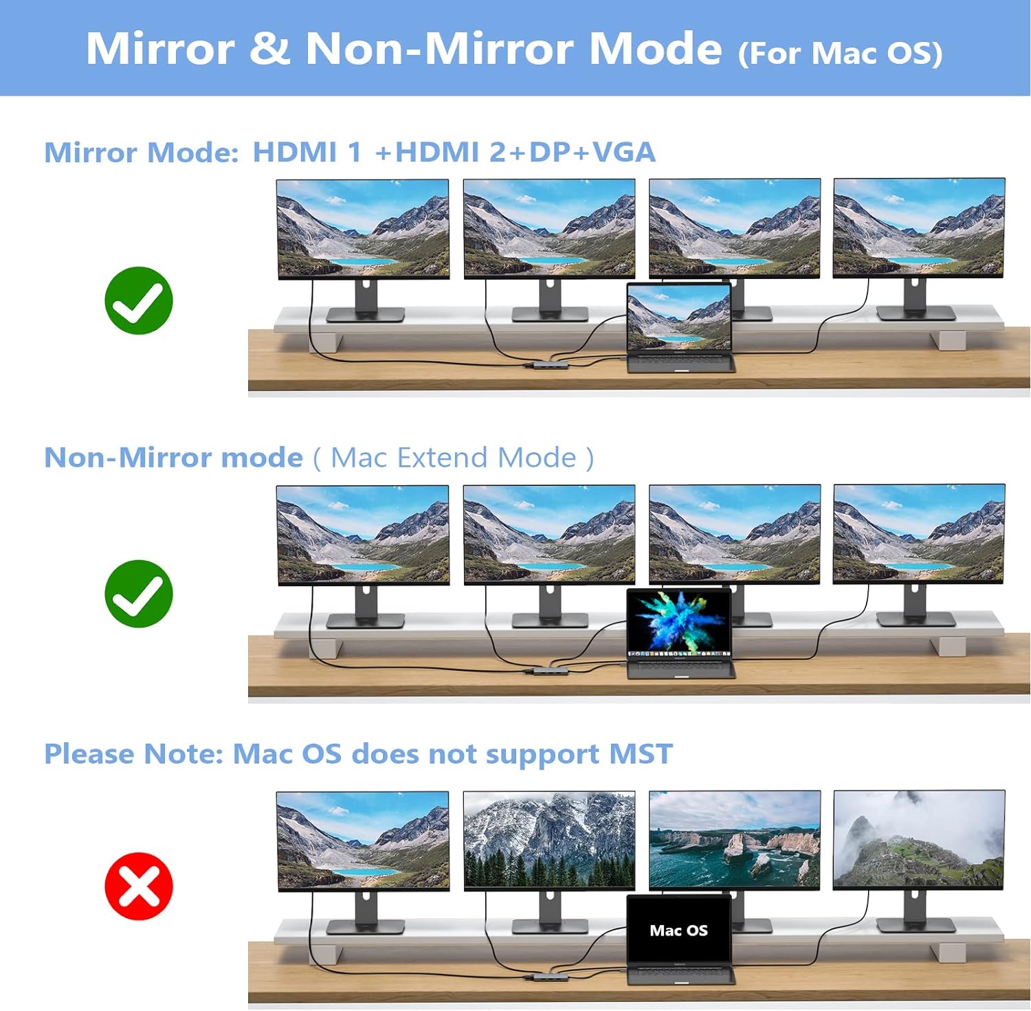 - Docking Station 4K Display Adapter: The Laptop Docking Station with 4 video output ports: 2 HDMI+DP+VGA, can output up to 4K Dual/Triple Display videos; For quadruple display Dual HDMI, DP, and VGA all are 1080@60Hz. Please make sure your laptop specification support DP1.4 signal output. If the VGA port is connected, it will affect the resolution of all displays up to 1080P only