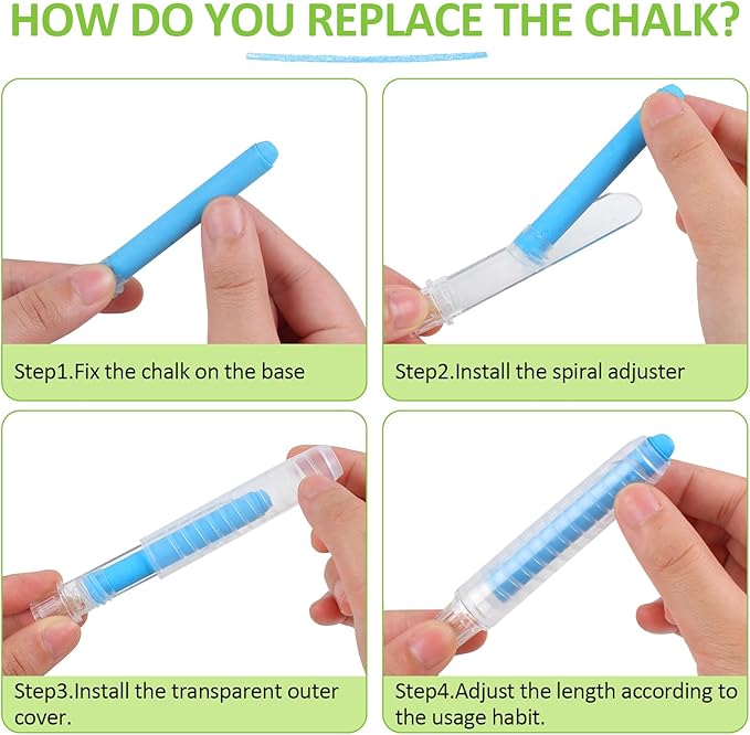 - EASY TO USE: the chalk for chalkboard chalk and eraser set including the shell has a total length of about 4 inches and a diameter of about 0.7 inches, which is a comfortable and versatile size and easy to hold. To use, pinch the top of the kids chalk with one hand and rotate the clear pen sleeve left or right with the other hand to adjust the length of the non toxic chalk easily. (Tip: If you want to replace the chalk, please insert the flat end of the chalk into the threaded bottom sleeve, the chalk is more stable and the writing will not slip out.)