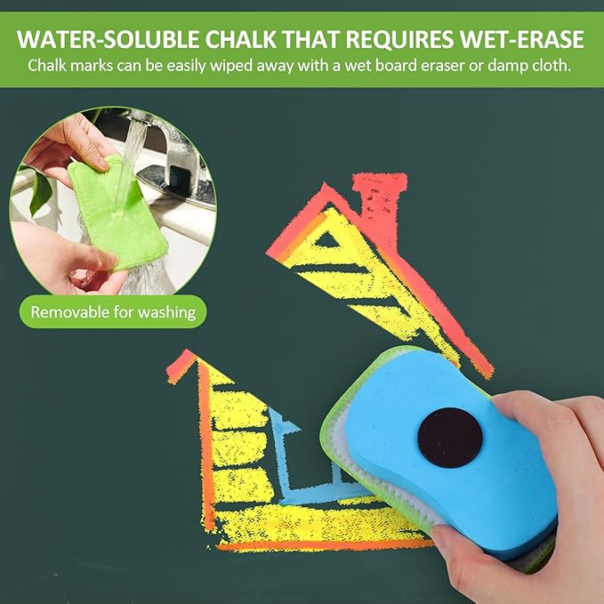 - WASHABLE: If you love to draw, you always worry that the ink is hard to clean, but you don't have to worry about that with our chalk for chalkboard chalk and eraser set. Our dustless chalk for kids can be cleaned with water by gently rubbing, you can DIY on your clothes as you like, the colors are bright and the writing is clear.