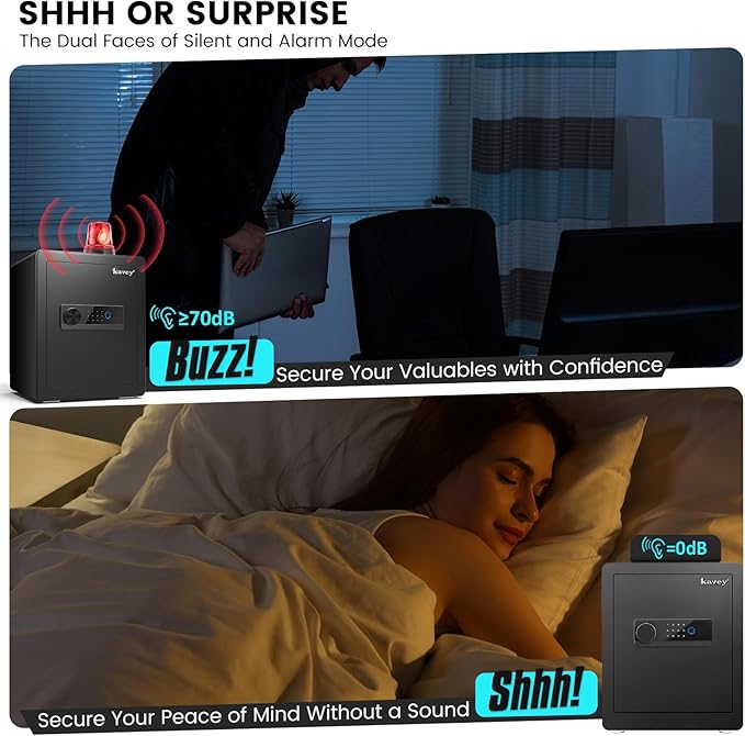 • POWERHOUSE OF SAFETY, DUAL ALARM MASTERY - Hey, safety isn't just a talk—it's a sure thing with the Kavey Home Safe! This money safe is like a security champ with its dual alarm system, ready to take on thieves and those nosy hands. Mess up the password thrice or try to bust in forcefully, and bam! The safe springs into action. And guess what? It belts out a loud 70-decibel alarm that fills the room, scaring off even the bravest intruders. Cool, right?