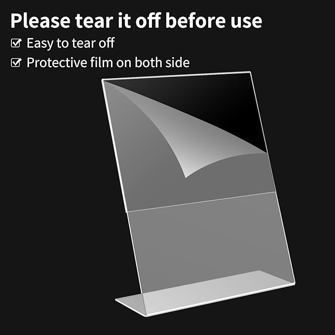 - Important: Please peel off the film before using the acrylic sign holder. There is anti-scratch film on both sides. It can be torn off, otherwise the acrylic sign holder will look unclear when in use.