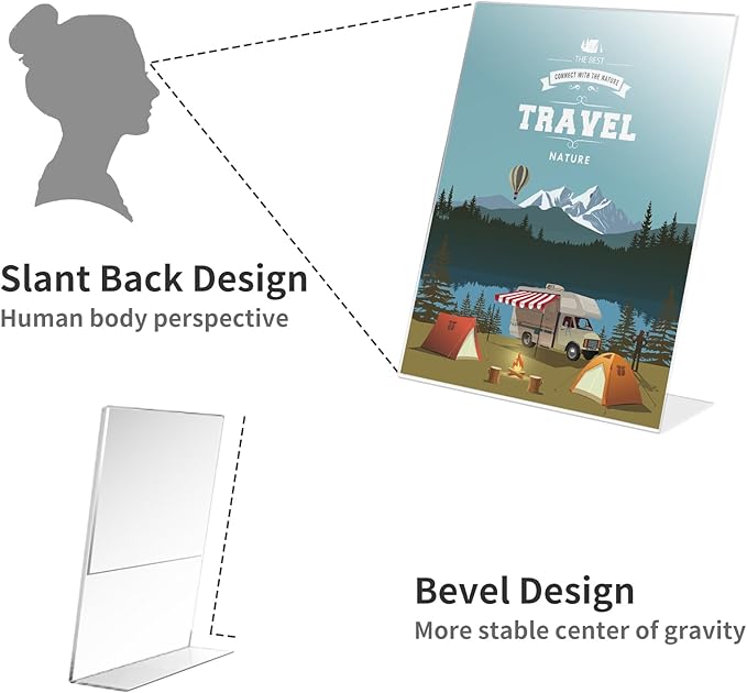 - Self-standing Design: No assembly required. Each acrylic sign holder 8.5 x 11 has an opening on the side for easy paper insertion. Simply slide the paper in from the side of the clear sign holder to display your advertisements, posters or menus. This acrylic paper holder has a slanted back design, the bottom of the holder is stable can stand firmly on the table, which makes it an ideal choice for office to display pictures, announcements or advertising brochures.